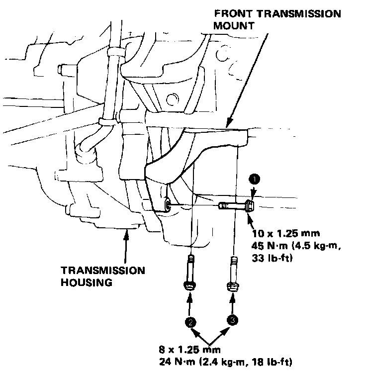 8. Install the engine torque bracket on the transmission housing. Torque its bolts to 45 N.m (4.5 kg-m, 33 lb-ft).