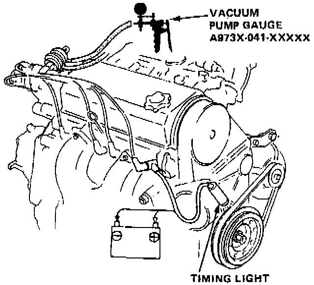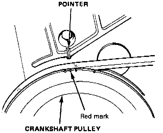 3. Reconnect vacuum hoses and connect timing light to the engine. While the engine is at idle, point a timing light toward the pointer at the crankshaft pulley. If ignition timing is not within specifications, verify the integrity of the vacuum advance diaphragms.