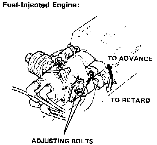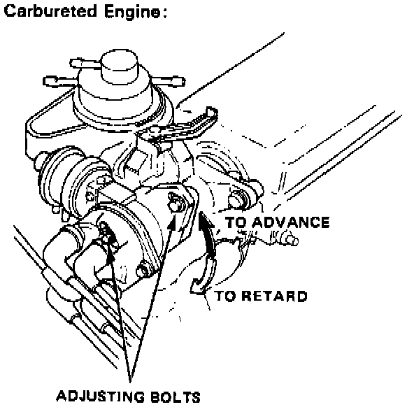 5. Loosen the distributor adjusting bolts, and turn the distributor housing counterclockwise to advance timing or clockwise to retard timing.