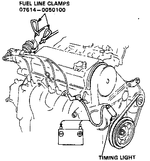 9. Disconnect the vacuum hoses from the vacuum advance diaphragm and pinch the end of the hoses using the fuel line clamps. The timing should be 4° BTDC.