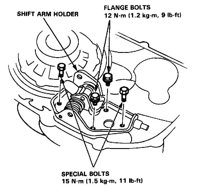 4. Align the shift arm with selector arm and install the shift arm holder. Install the bolts, using the correct bolt in each hole, and torque as shown.