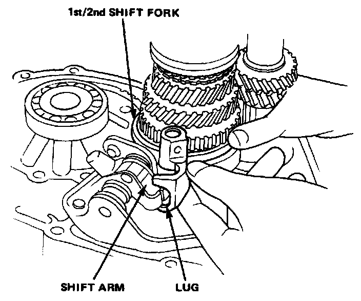 7. Install the 1st/2nd gear shift fork on synchro sleeve, then rotate into place so that lugs on back of fork fit over shift arm.