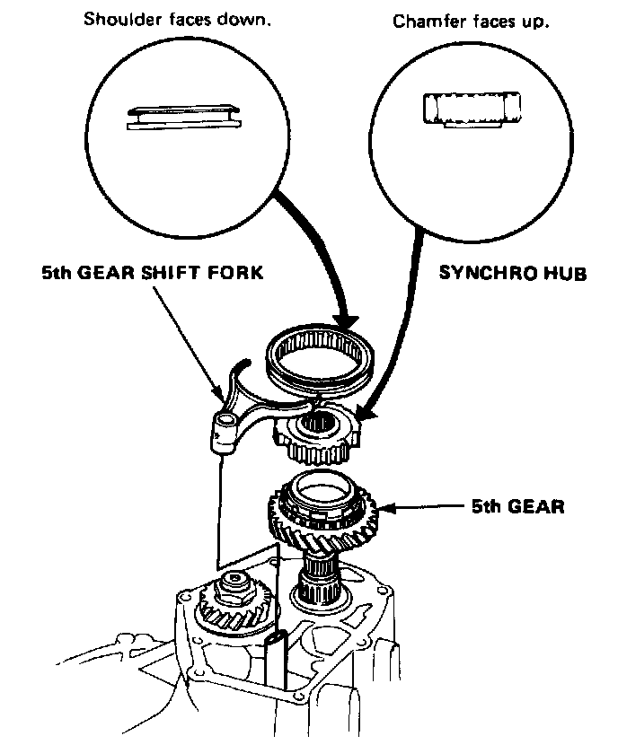 NOTE: Install the synchro hub with its raised inner shoulder facing down.