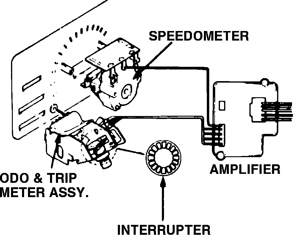 The speed sensor, Figs. 75, 76 and 77, is essentially a photo interrupter and is mounted in the speedometer. It is activated at a predetermined vehicle speed by a sealed plate rotating with the speedometer shaft.