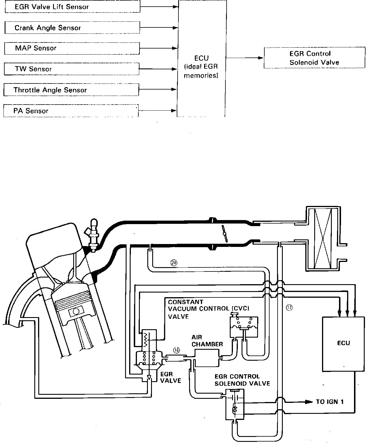 The ECU contains memories for ideal EGR valve lifts for varying operating conditions. The EGR valve lift sensor detects the amount of EGR valve lift and sends the information to the ECU. The ECU then compares it with the ideal EGR valve lift which is determined by data sent from the other sensors. If there is any difference between the two, the ECU triggers the EGR control solenoid valve to reduce vacuum applied to the EGR valve.