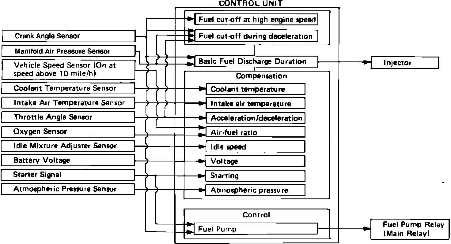 With the ignition switch in the run position, the main relay also supplies voltage to each fuel injector through a dropping resistor. Once the ECU decides how long it wants each injector to stay open (after sampling a variety of sensors, such as air and coolant temp. and engine speed and load) it grounds each injector for the proper duration.