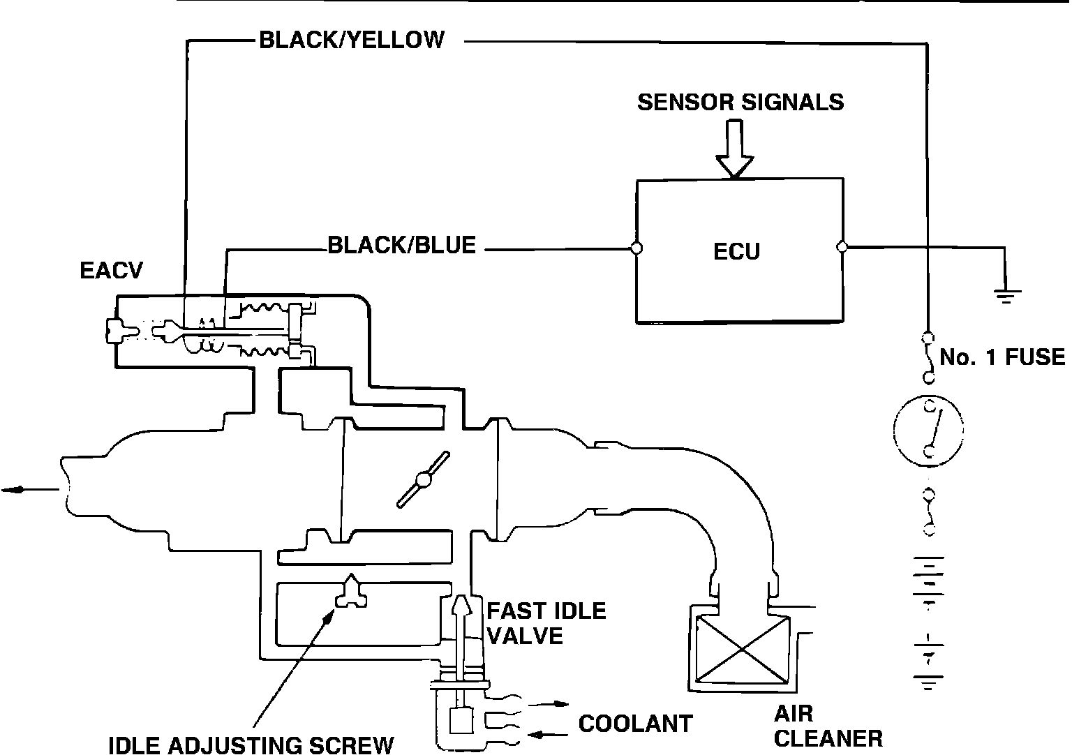 The idle control system, Fig. 10, controls engine idle speed via an electronic air control valve (EACV) and a fast idle valve. The EACV valve changes the amount of air bypassing into the intake manifold in response to electrical current sent from the ECU. When the EACV is activated, the valve opens to maintain proper idle speed