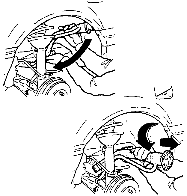 1. Disconnect both hoses from the fuel filler pipe. Remove the mounting bolt and three mounting nuts. Remove the pipe by moving the bottom end forward and pivoting the top end down and out.