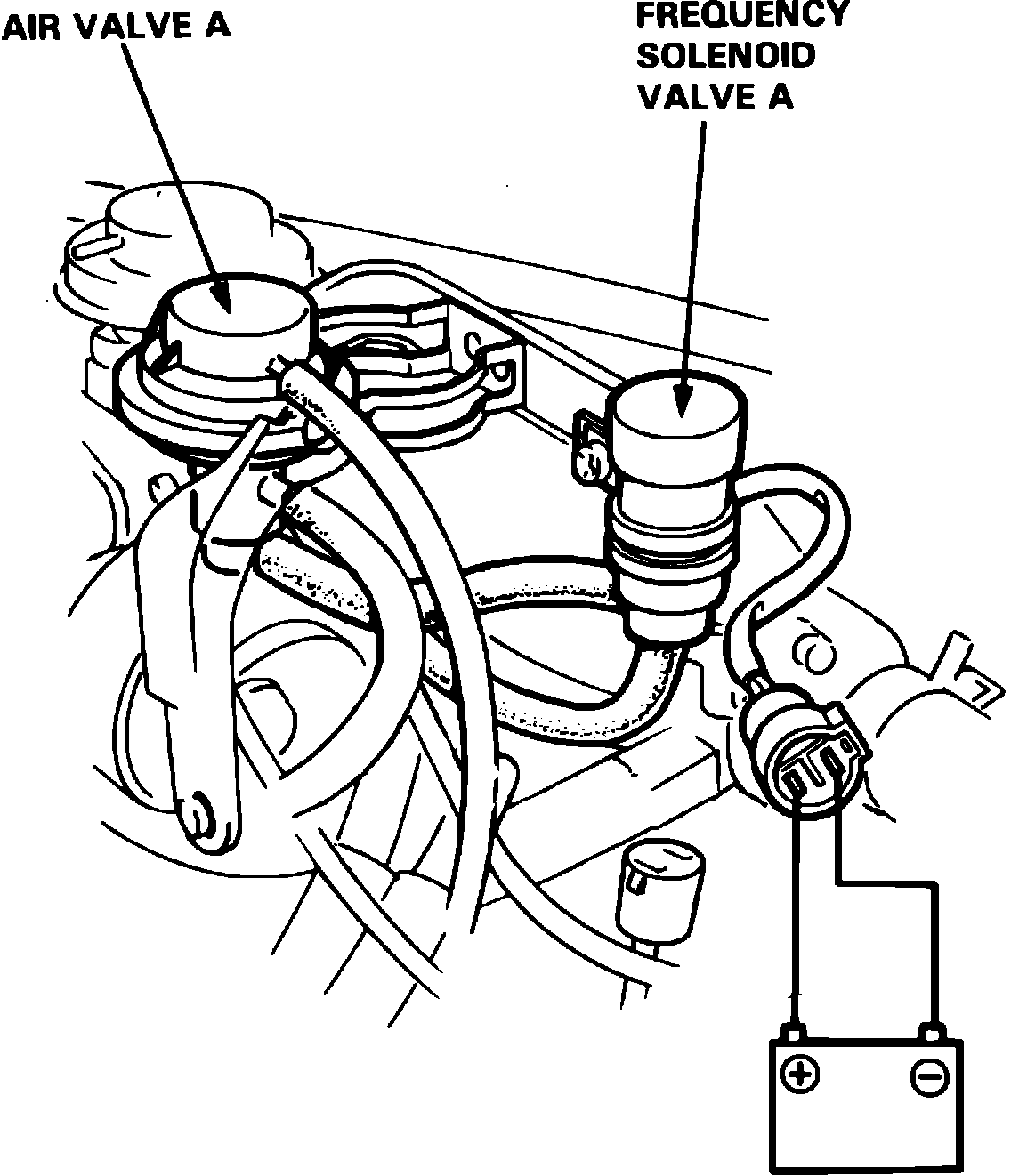 c. On 1987 Prelude, disconnect electrical connector from frequency solenoid valve A and connect battery to valve terminals as shown in Fig. 10.