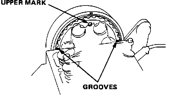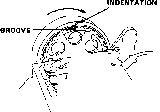 4. Rotate crankshaft 180° counterclockwise. TDC groove on the camshaft pulley should align with the indentation on the belt cover. The "UP" mark should not be visible. Distributor rotor should be pointing to the #3 spark plug terminal.