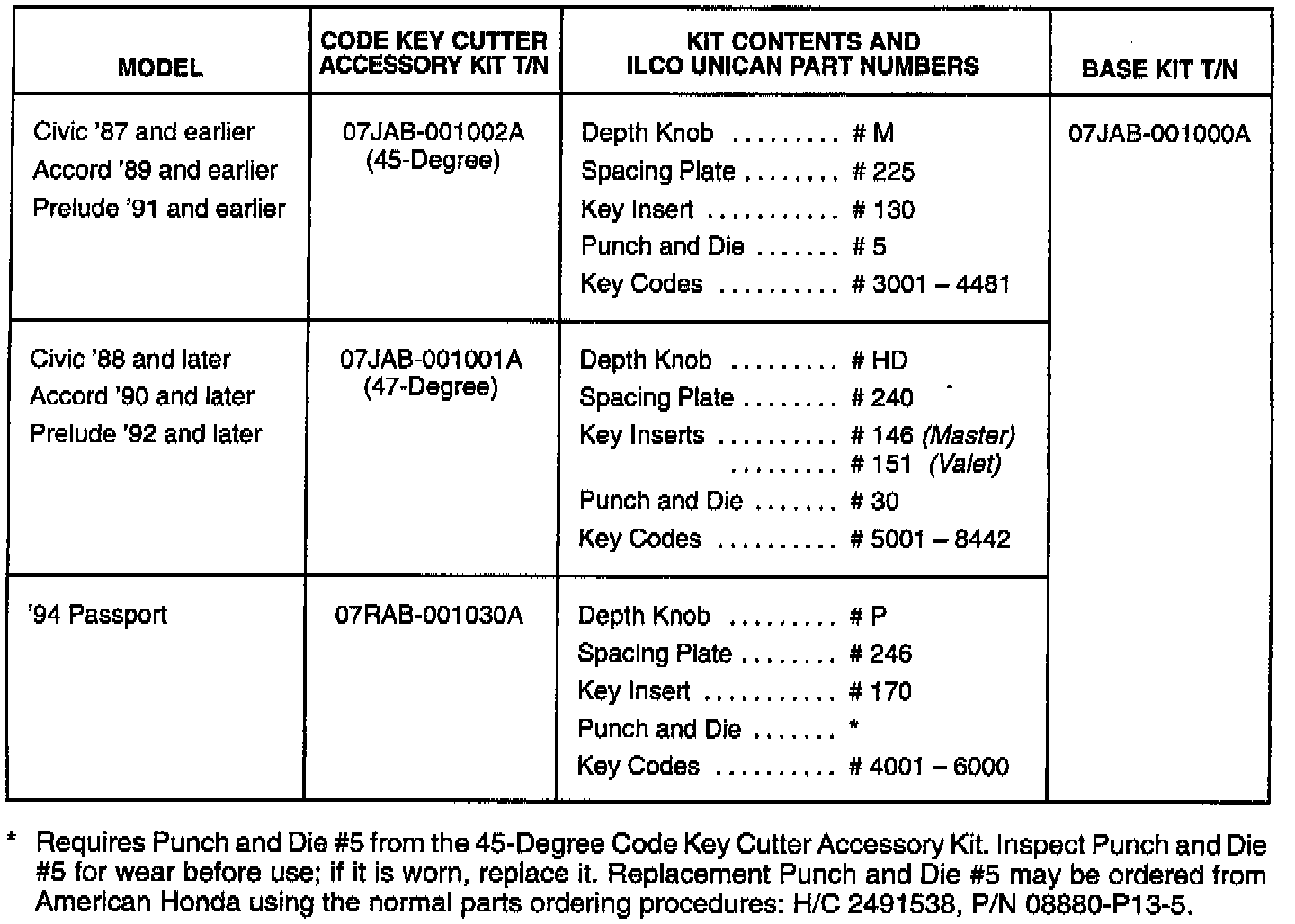 ^ The Exacta Code Key Cutter Base Kit and Accessory Kits are available from American Honda using your normal parts ordering procedures. The kits will be shipped to you directly from the manufacturer. If you need to order individual replacement parts, or if items are missing from your shipment, contact IIco Unican Co. at (800) 334-1381, and ask for the American Honda sales representative. Refer to the Application Chart for IIco Unican part numbers.