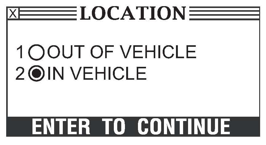 7. Use the arrow or number keys to select the location of the battery, either OUT OF VEHICLE or IN VEHICLE, then press Enter.