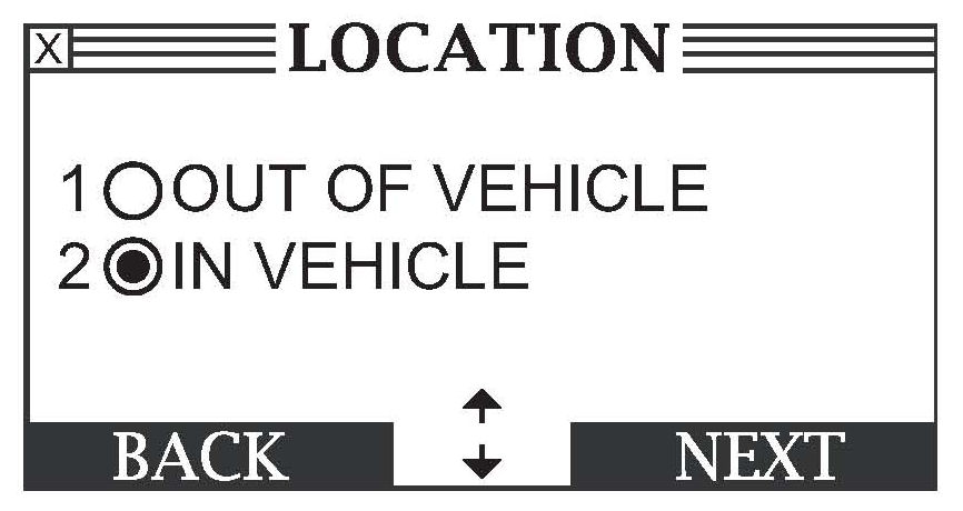5. Use the arrow or number keys to select the location of the battery, either OUT OF VEHICLE or IN VEHICLE, then press Enter.