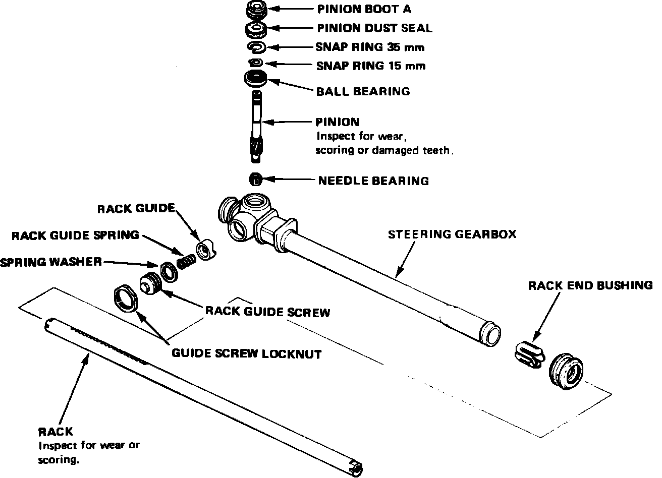 3. Install rack and pinion into steering gear, then snap rings and seals.