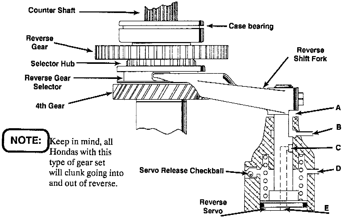 To fix a Honda that grinds in Reverse and/or out of reverse you first need to understand how it works. The normal position (i.e. park, neutral, drive, 3rd and 2nd) of the reverse/4th gear set is shown in the figure below. When the manual control valve is moved to the reverse position, oil charges the bottom of the reverse servo including port E located on the servo. As the servo moves up, port C & B will be connected. At this point, the reverse gear selector will be engaged to the reverse gear and the reverse servo oil can now flow out port B to apply the