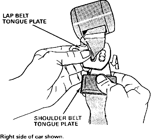 9. Attach the shoulder belt to the anchor point in the "C" pillar, then attach the shoulder belt to the lap belt tongue plate.