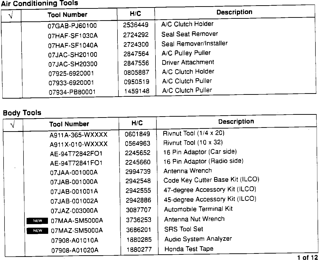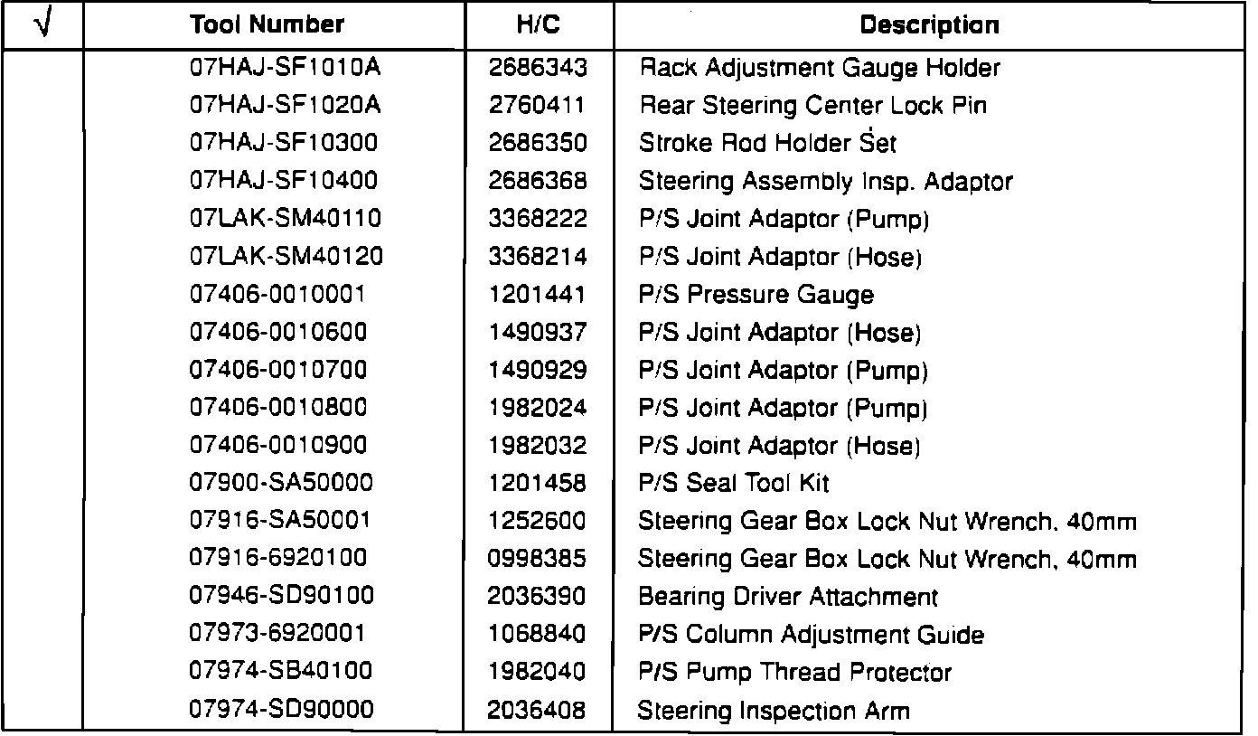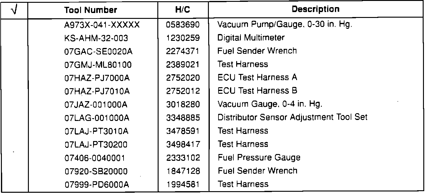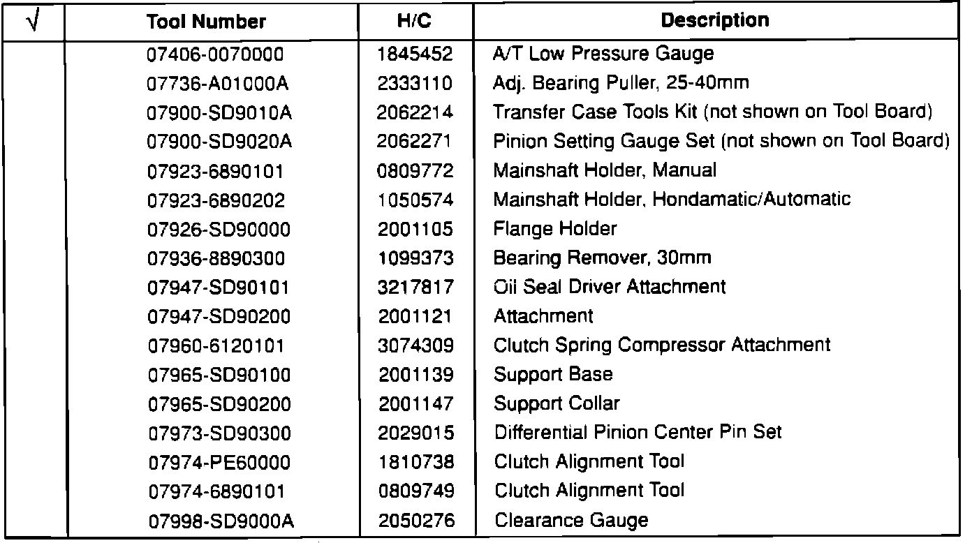 These tools are available from American Honda. Check those tools you already have on hand.Air Conditioning and Body