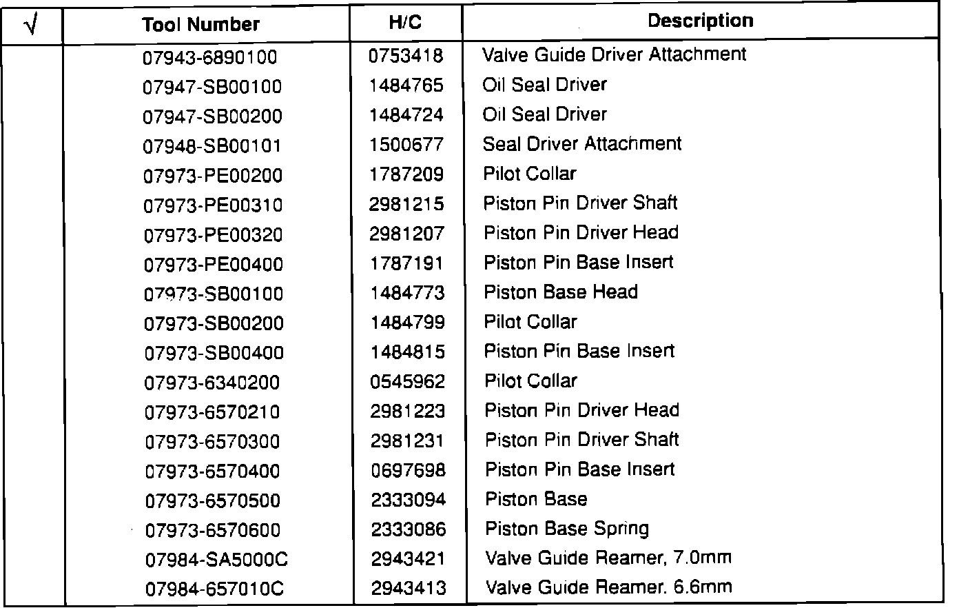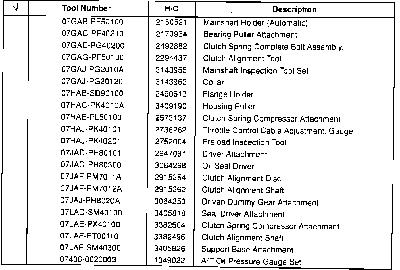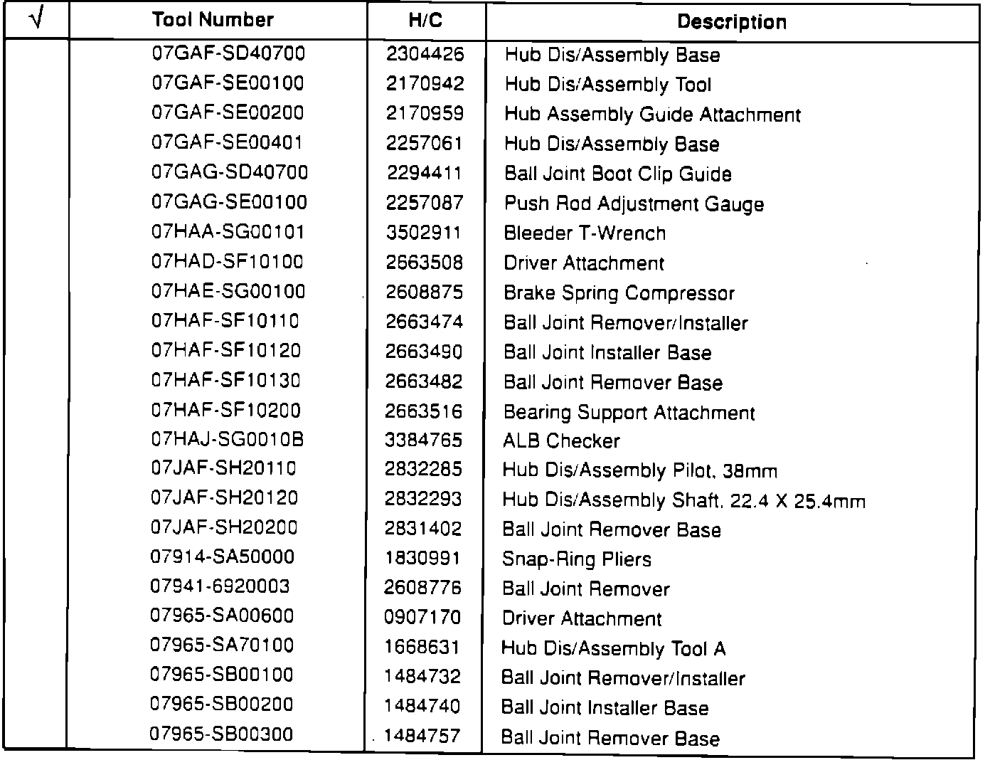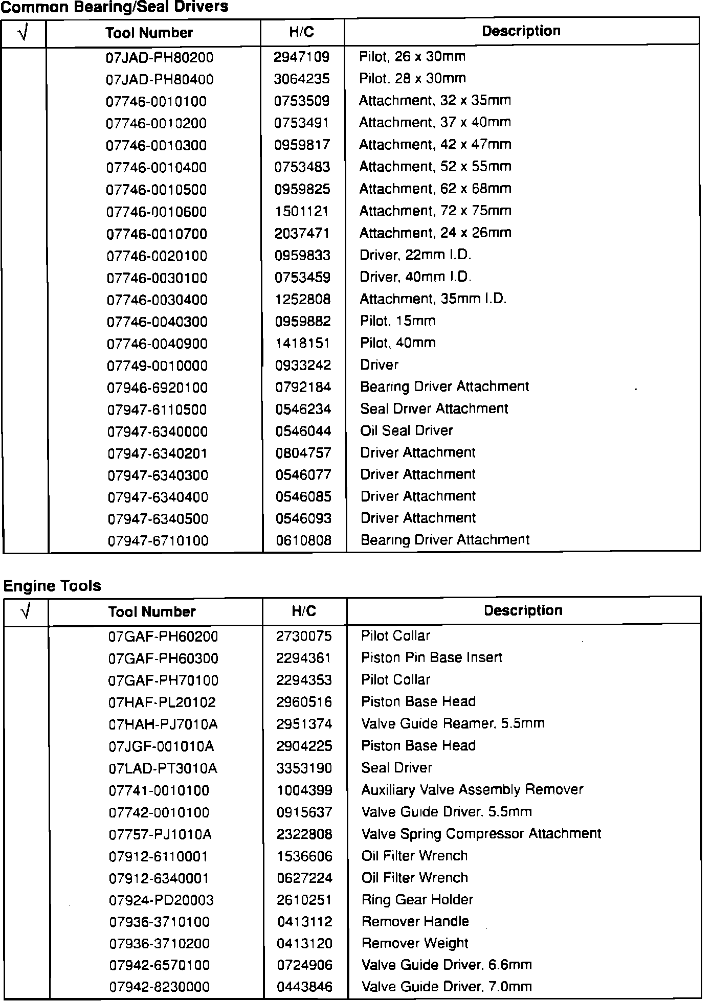 These tools are available from American Honda. Check those tools you already have on hand.Air Conditioning and Body