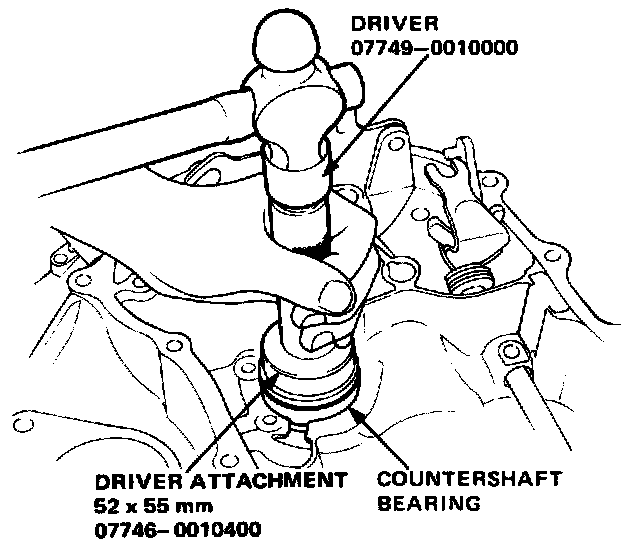 8. Drive in countershaft bearing with support block placed under case to support bearing boss.