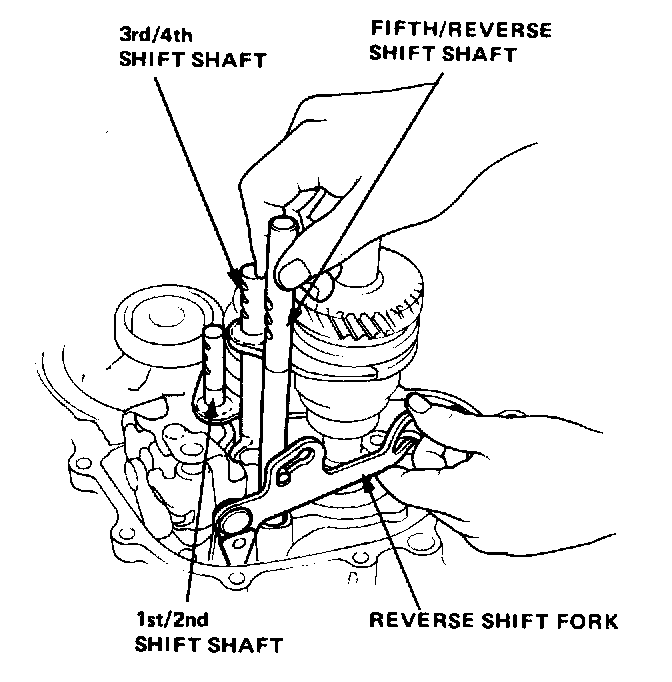 6. Remove the 5th/reverse shift shaft by pulling it up while lifting the reverse shift fork.