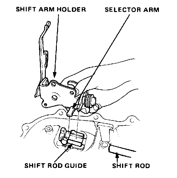 Hook selector arm and shift arm into shift rod guide.