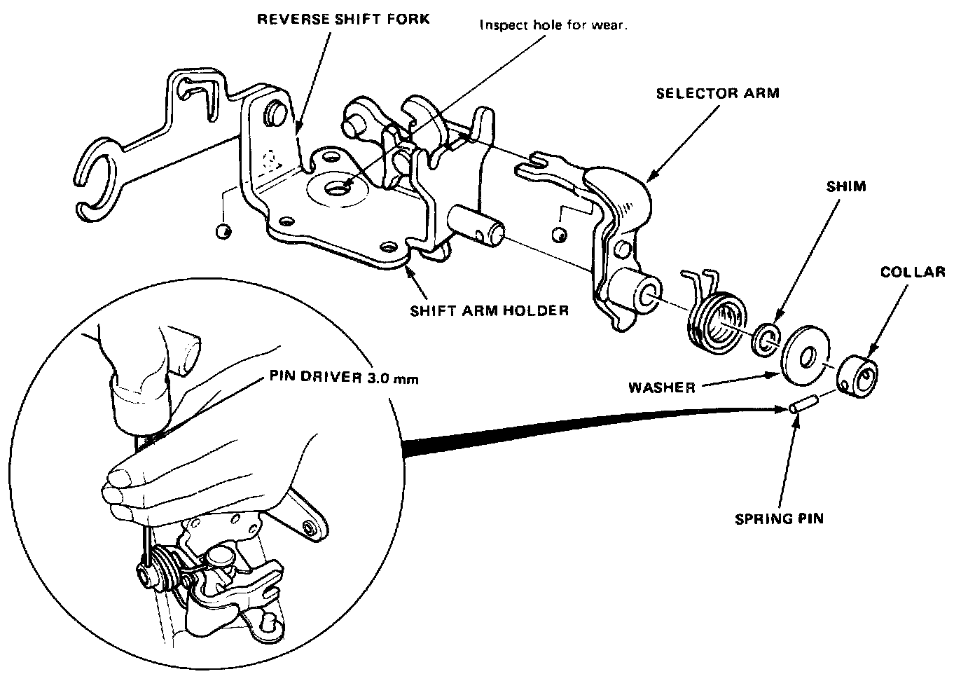 To remove selector arm from holder for shimming or replacement, drive out spring pin with driver.