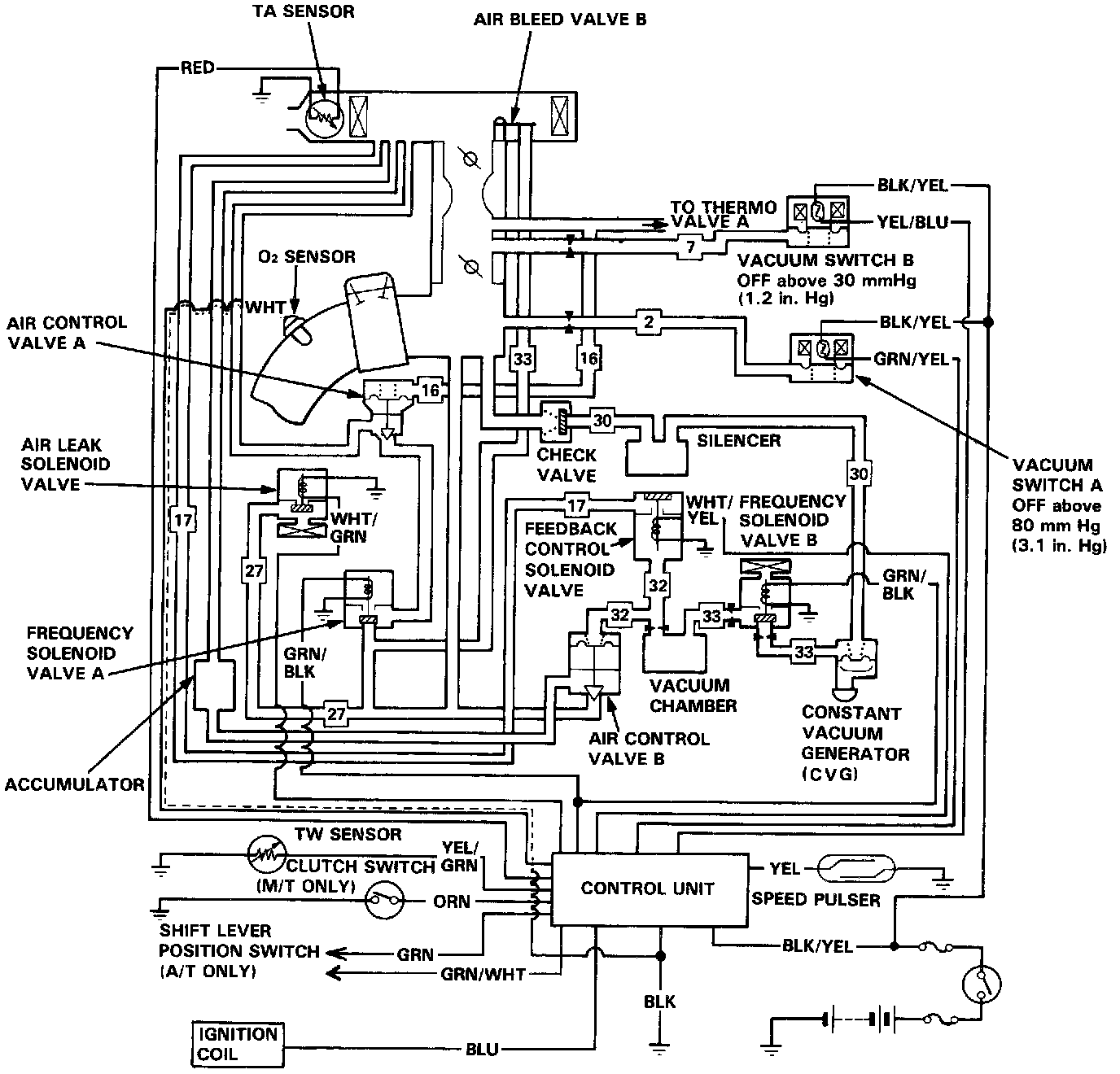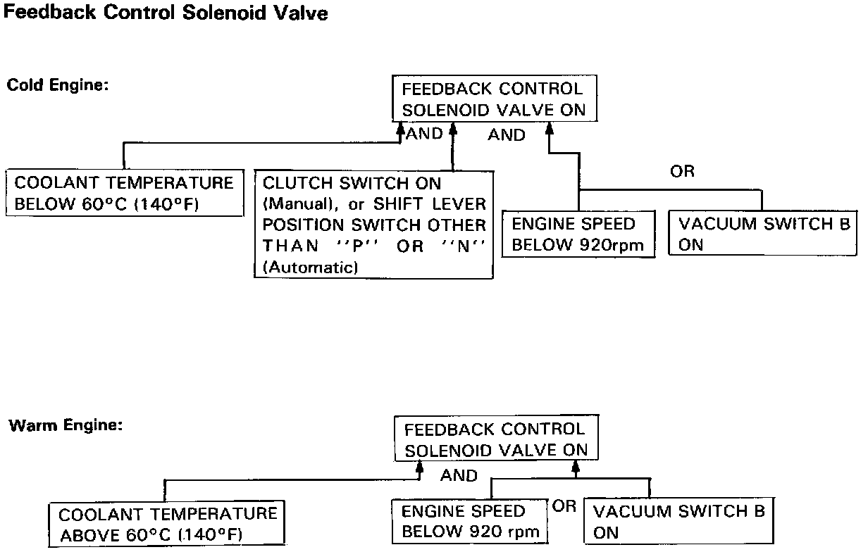 The feedback control solenoid valve is provided to stop feedback operation at low engine speed such as idling. Frequency solenoid valve B gets signals through the [1][2]control unit from the oxygen sensor installed in the exhaust manifold. Air control valve B is opened only when the oxygen content is less than stoichiometric (rich air-fuel ratio).