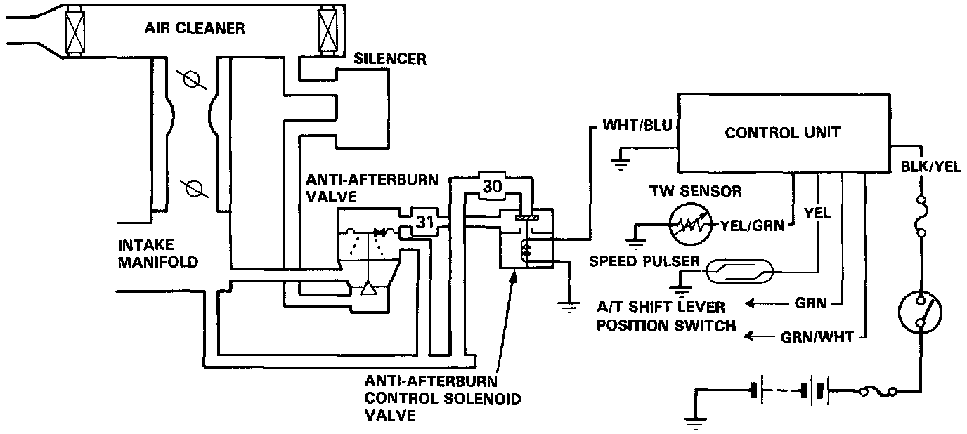 The anti-afterburn valve senses intake manifold vacuum change during gear shifting or deceleration, and supplies fresh air into the intake manifold in order to prevent the escape of unburned fuel.