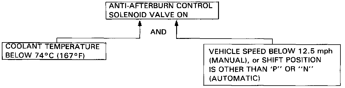 The anti-afterburn control solenoid valve is provided to control the operation of the anti-afterburn valve by introducing manifold vacuum to the anti-afterburn valve diaphragm holding the valve closed. When the engine coolant temperature is below the set temperature of the thermosensor, and vehicle speed (only for M/T) is below the preset value of the [1][2]control unit or the shift lever position switch (only for A/T) is at the Neutral or Park position, the anti-afterburn control solenoid valve is activated to open the vacuum passage. When the anti-afterburn control solenoid valve opens, the anti-afterburn valve does not open because there is no vacuum difference on the diaphragm.