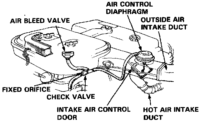 - As the outside air temperature drops, the bimetal spring in the bleed valve closes, causing the air control door to rise and allowing pre-heated air into the air cleaner; consistent intake air temperature (approximately 100°F) is maintained in this way.
