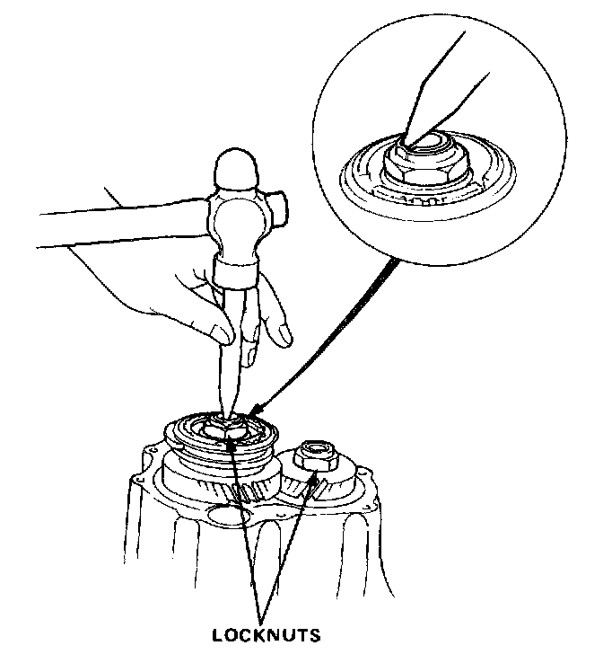 2. Bend locking tab on locknuts out of slots in mainshaft and countershaft.