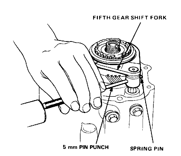 7. Drive out spring pin securing fifth gear shift fork to shaft.