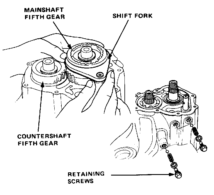 8. Remove mainshaft fifth gear, shift fork, synchronizer sleeve, hub, ring and spring as a unit.