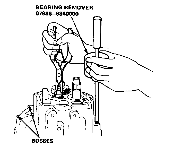 13. Loosen the transmission housing by tapping on bosses around its edge with a soft hammer. Remove the attachment from the remover then screw its threaded end into the hole in the transmission housing as shown. Expand the snap ring while tapping upward on the case using the bearing remover.