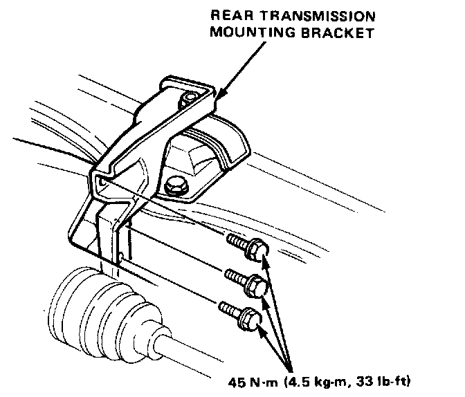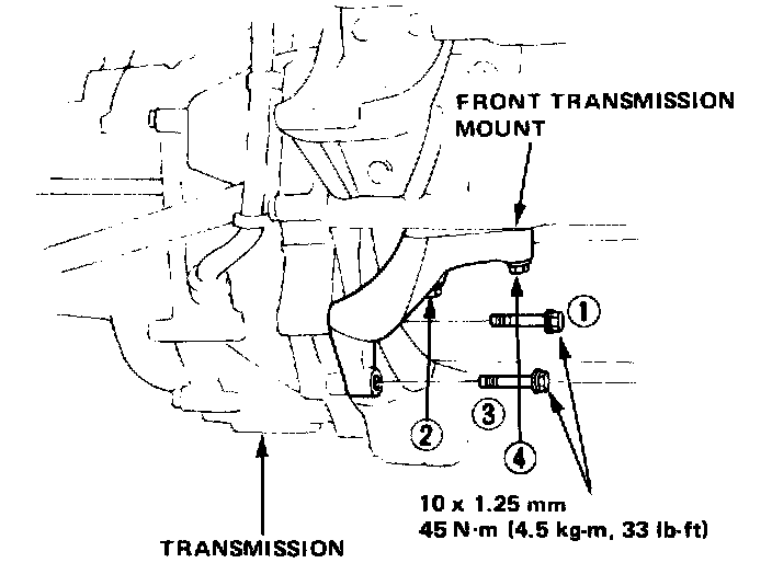 7. Loosely install the bolts for the front transmission mount, then torque to 45 N-m (4.5 kg-m, 33 lb-ft) in the sequence shown.