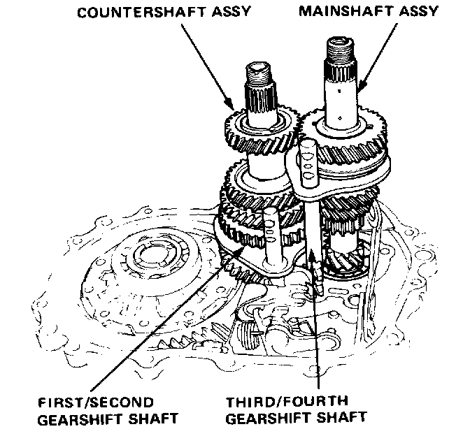 2. Install mainshaft, countershaft, first/second gear shift shaft and third/fourth gear shift shaft together as an assembly. Make sure forks are in fourth and second gear positions to make installation easier.