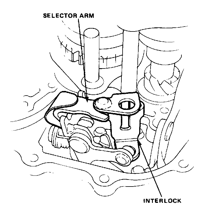 3. Lift mainshaft as shown and install interlock into the selector arm.