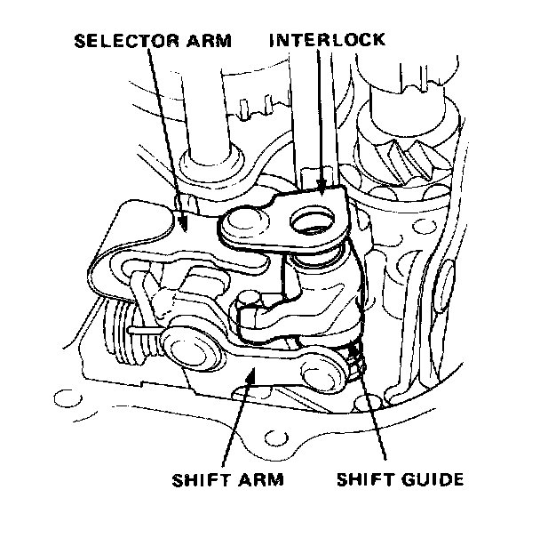 5. Hook interlock into selector arm, first/second gearshift shaft and third/fourth gearshift shaft. Hook shift guide into shift arm.