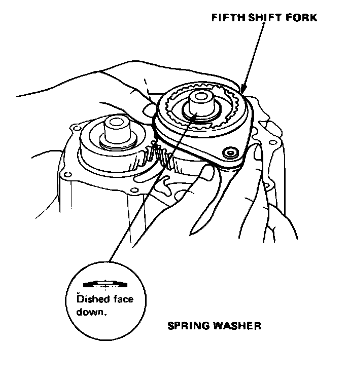 16. Install countershaft fifth gear with high side facing down. Then install spring washer with dished surface facing fifth gear.