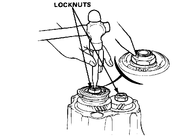 25. Stake shoulders on locknuts into slots in mainshaft and countershaft.