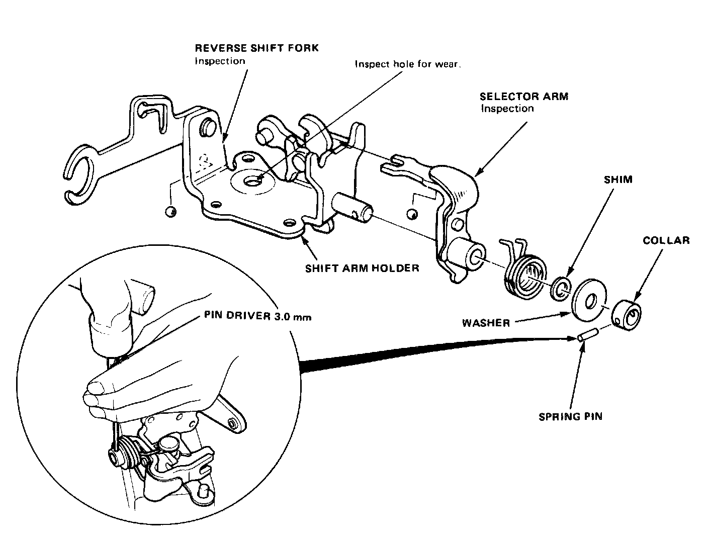 To remove selector arm from holder for shimming or replacement, drive out spring pin with driver.