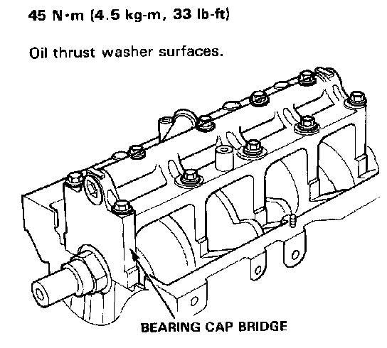 6. Install the thrust washers, main bearing halves cap and cap bridge, check clearance with plastigage then torque the nuts to 45 N.m 14.5 kg-m, 33 lb-ft).
