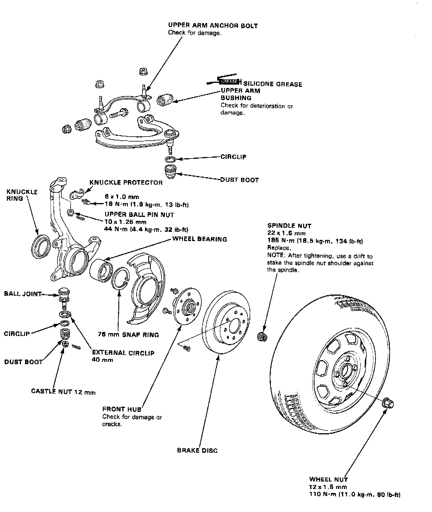 4. Remove the knuckle protector, the upper ball pin and upper ball pin nut, the self-locking nuts and upper arm anchor bolts.