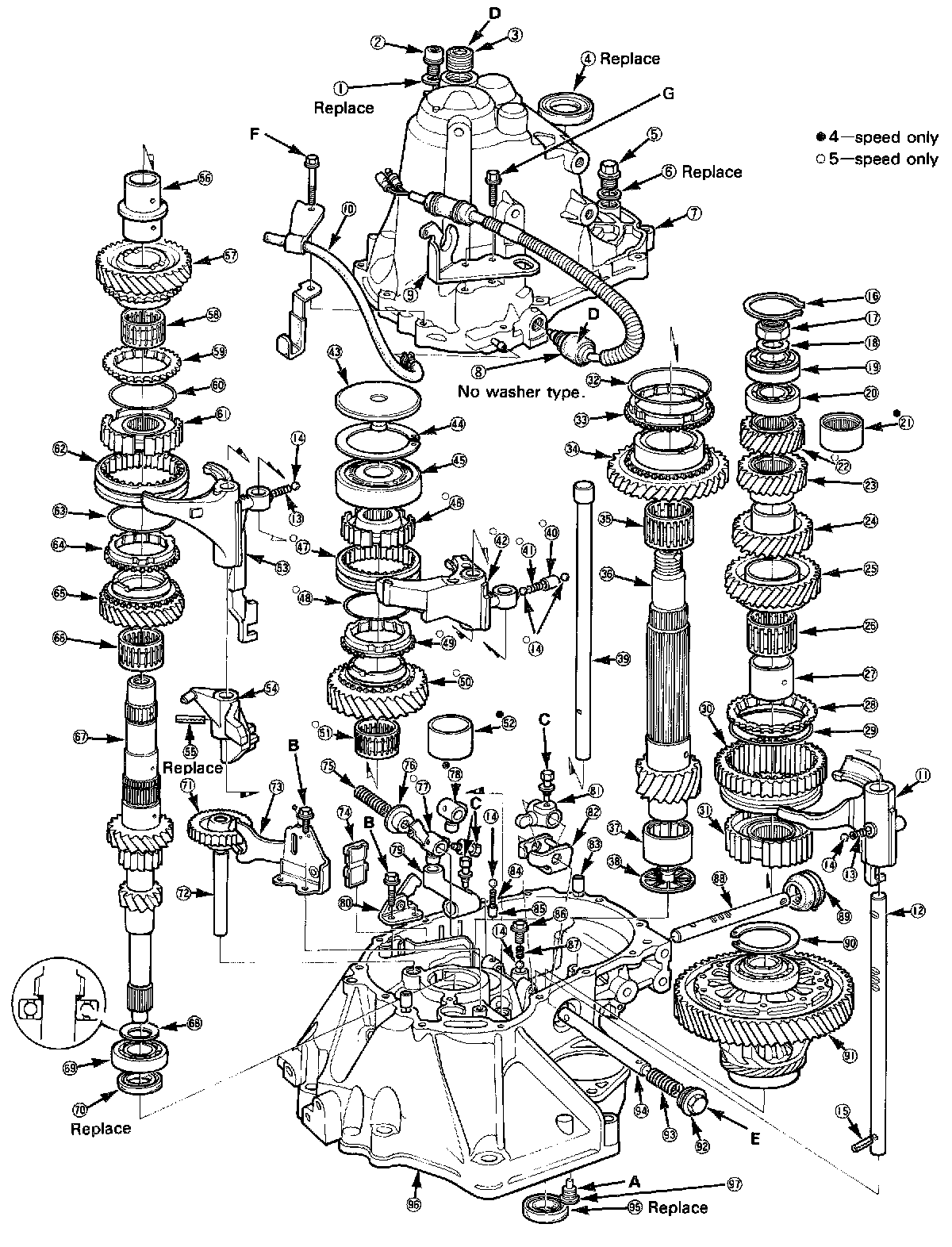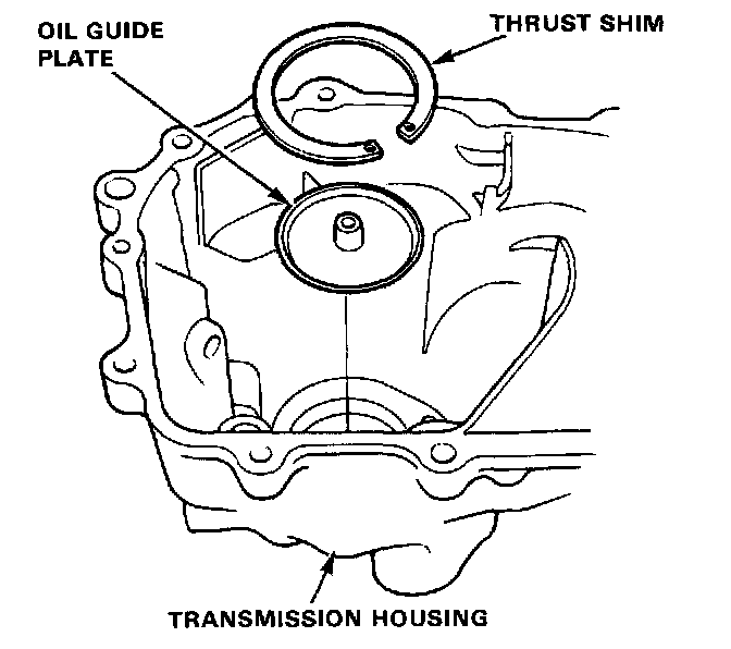 17. Install the oil guide plate and mainshaft thrust shim into the transmission housing.