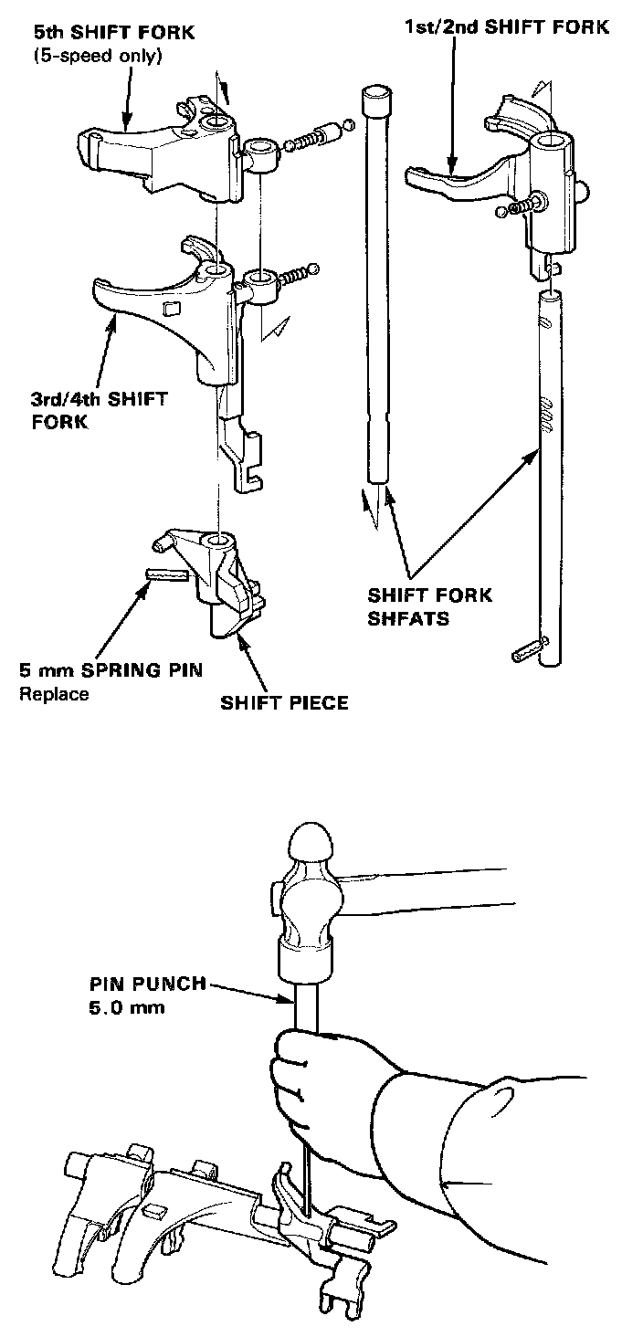 8. Insert the shift fork shaft into the shift forks and drive in the spring pin through the shift piece.