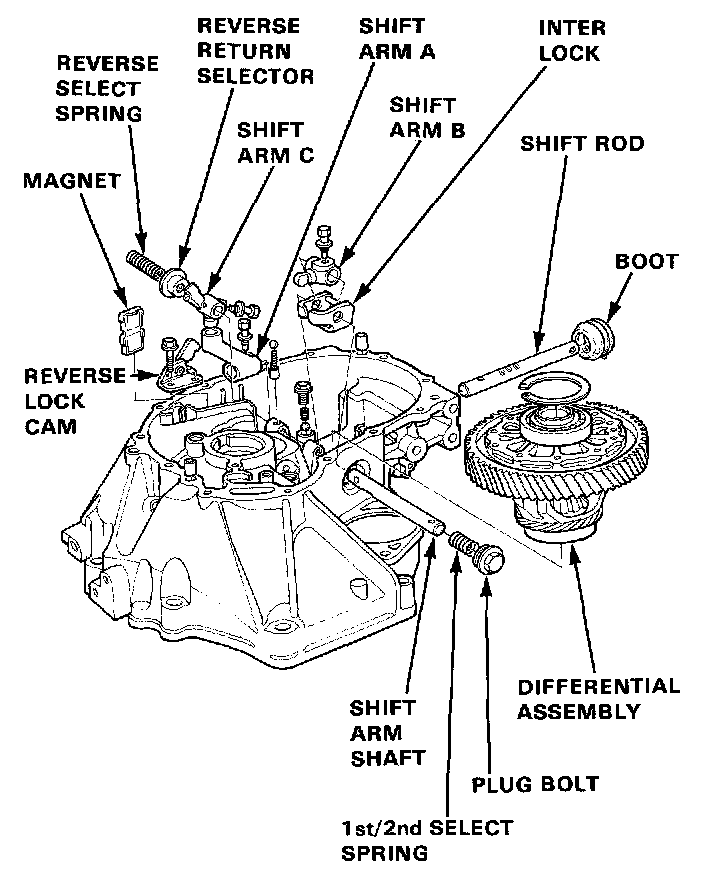 4. Remove the shift arm shaft, reverse select spring, reverse return selector, shift arm C, interlock, shift arm B, steel ball, spring and spring collar.