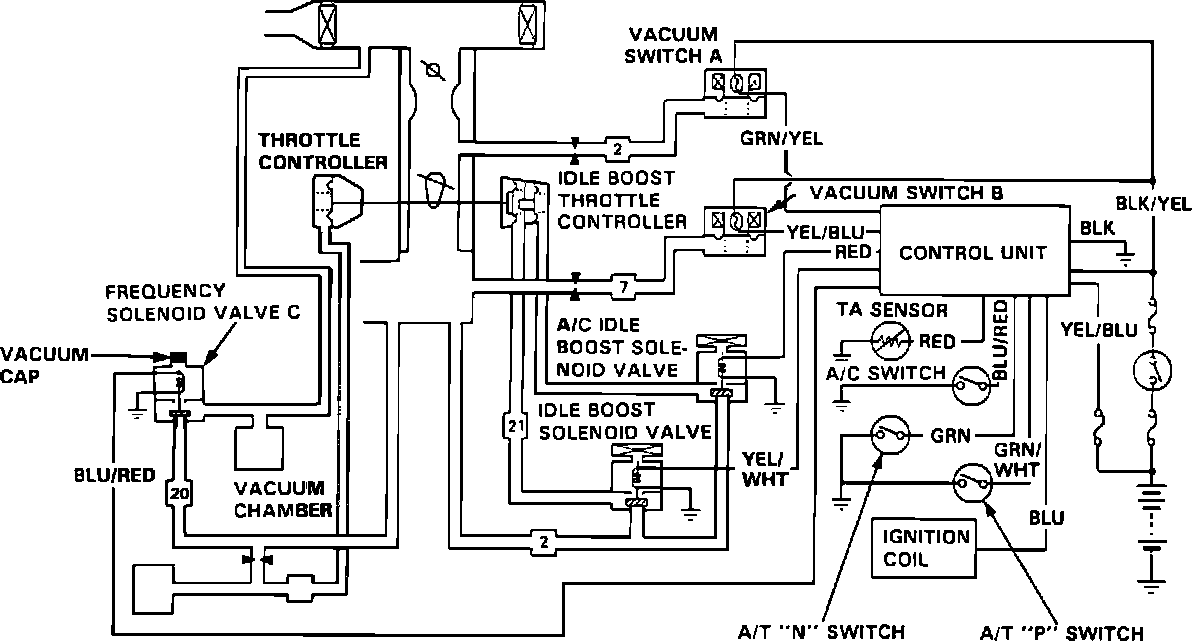 This system maintains a stable idle speed under different engine loads. Idle control is accomplished using two throttle controllers, the idle boost throttle controller (with A/C, this controller has a dual diaphragm) and the throttle controller. The solenoid valve control unit monitors the inputs and directs voltage to the three solenoid valves: