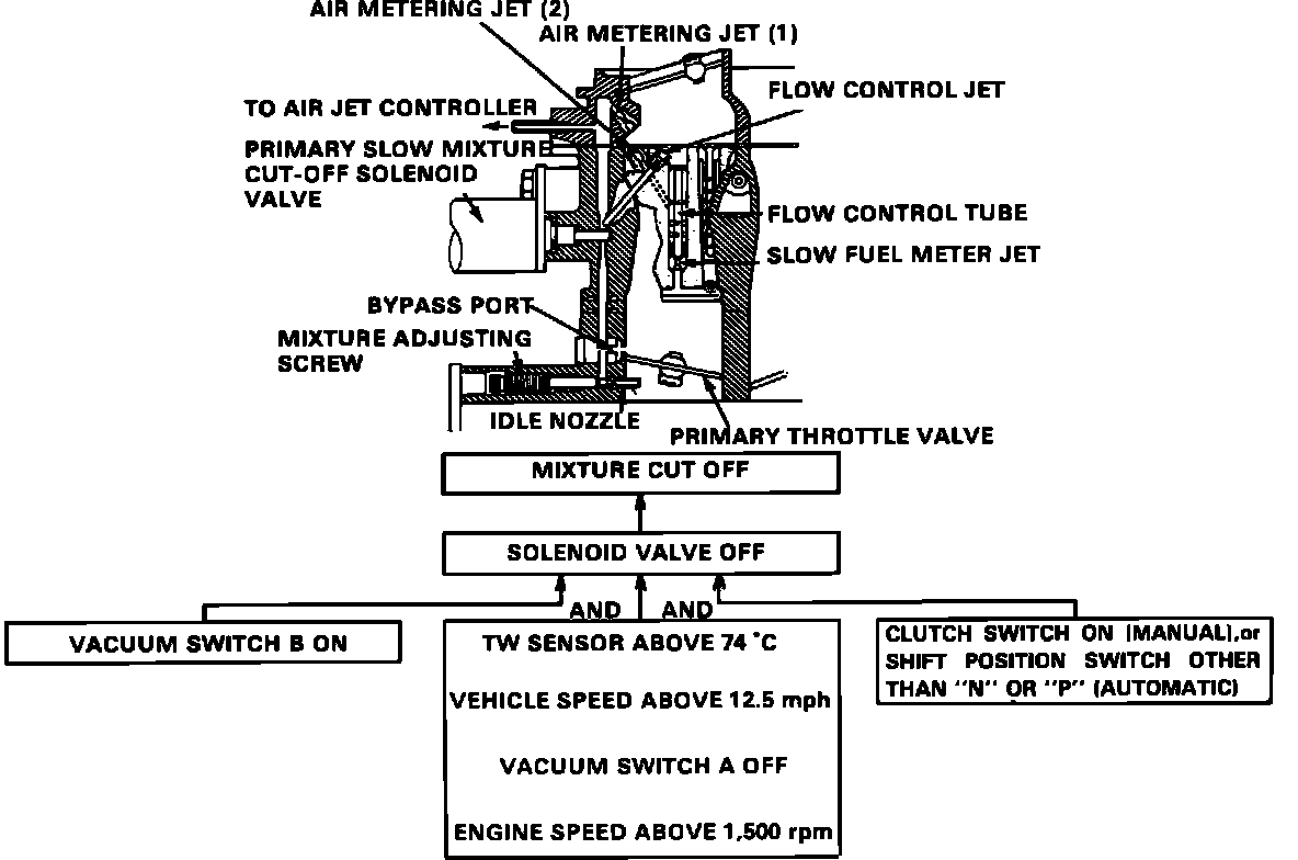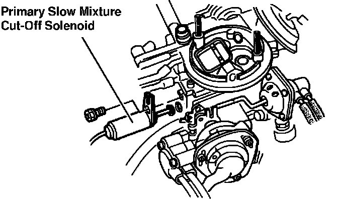 The primary slow mixture cut-off solenoid is mounted on the carburetor. It contains a spring loaded rod that protrudes into the fuel passage used by the idle circuit. When energized the rod is pulled out of the passage allowing normal fuel flow. It is used to close off the idle circuit fuel supply when the engine is shut off to reduce engine run-on. It is also used to lower emissions and improve fuel economy by cutting the fuel supply during sudden deceleration.