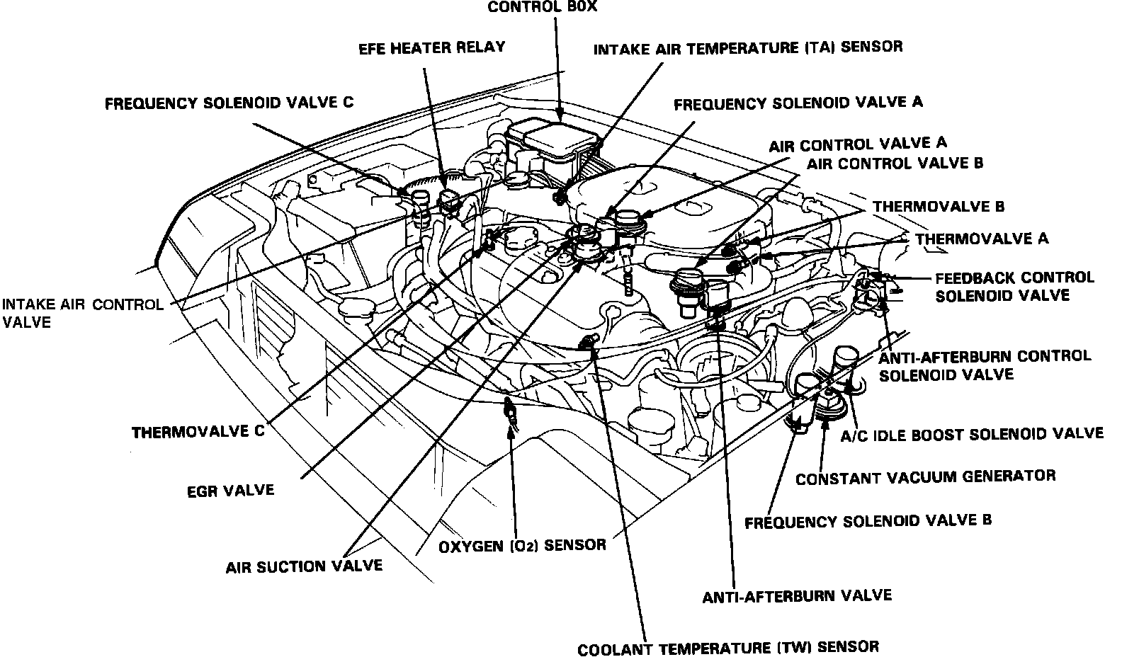 Frequency valve C is mounted on the subframe rail on the passenger side of the engine compartment, near the air cleaner intake duct.
