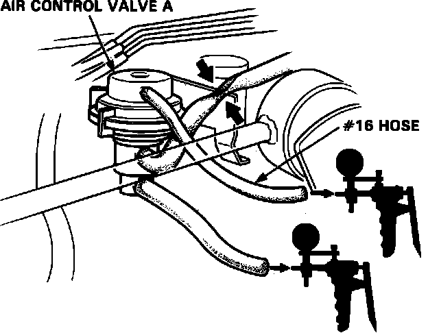3. Disconnect the lower hose from air control valve A and connect a vacuum pump to the hose. Apply vacuum to the lower hose. There should be a restricted leak.